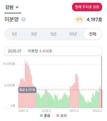 강원도는 아직 한창 하락장이 진행되고 있으며 가격이 더 떨어지고 있을 것이라는 점을 매물량의 증가 그래프를 통해 어렴풋이 짐작할 수 있습니다.