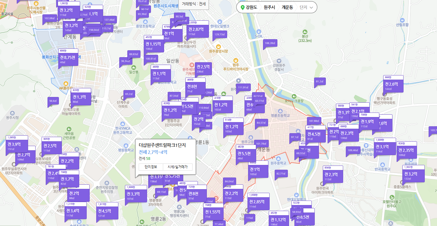 현재 원주시의 전세물건은 강릉보다도 더 넉넉합니다. 더샵원주센트럴파크1단지의 경우에 58건의 전세물건이 있으며 이 전세 물건이 모두 소진되기까지는 시간이 좀 걸릴 것으로 보입니다. 원주시 전체적으로 봐서도 전세물건이 아주 넉넉하게 있다는 것을 확인하실 수가 있습니다.