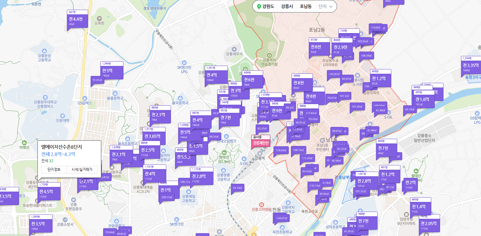 강릉시에 전세 물건은 엘에이키선수촌8단지에만 해도 32개의 전세 물건이 있으며 도시 전체적으로 전세 물건이 충분한 것을 보실수가 있습니다.