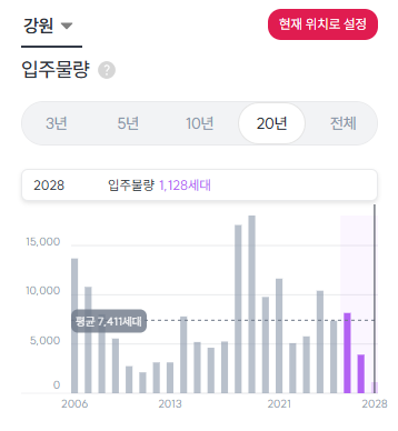강원도의 입주물량은 그렇게 많아 보이지는 않습니다. 2026년에 가장 많은 7000세대를 조금 넘긴 물량이 공급될 것이며 앞으로는 부동산 시장의 침체로 인한 건설사들의 건축 계획이 더 감소하고 있는 추세로 확인할 수 있습니다.