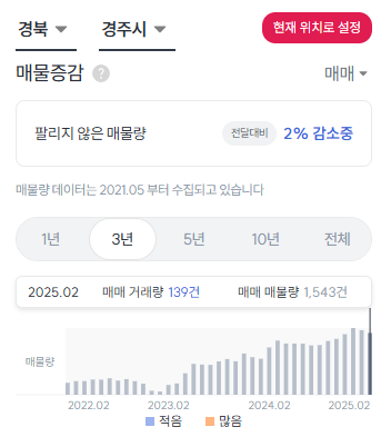 2025년 초에 매물량이 가장 많았으며 긍정적인 것은 점차 그 물량이 줄고 있다는 것입니다.