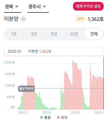 미분양물량은 여전히 많이 남아있는 것을 볼 수 있습니다. 현재 미분양 물량은 약 1362호 입니다.