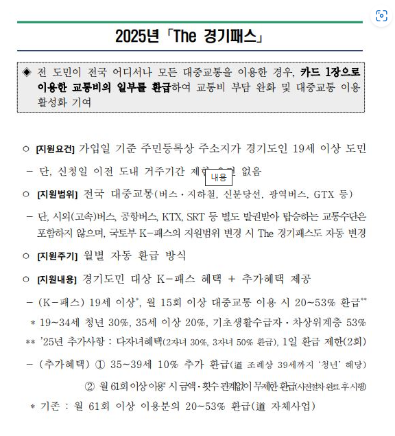 해당 지원되는 교통 수단은 버스, 지하철, 신분당선, 광역버스, GTX까지 교통비 환급이 가능합니다.