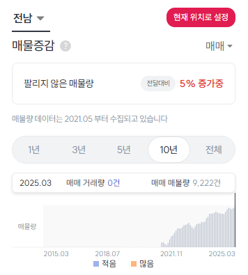 하지만 더 이상 매도하려고 나온 물건들에 관심을 가지고 매입하는 사람은 증가하지 않고 있습니다. 즉 전라남도에 투자를 하게 된다면 시세차익을 얻기 위해 꽤 오랜시간을 기다려야 할 수 있다는 점을 의미할 수 있습니다.