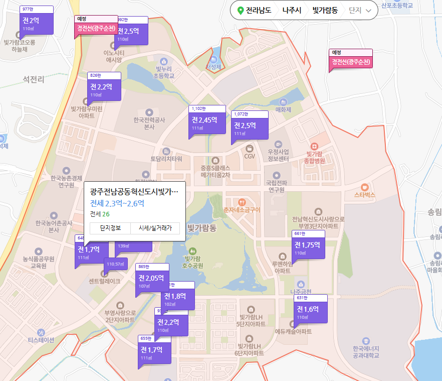 나주 역시 빛가람호수공원 근처로 조성된 2016년 준공된 아파트 대단지 들이 전세 물량을 많이 공급하고 있습니다.