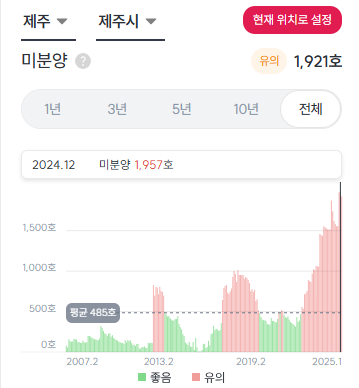 제주시는 매물량의 증가도 심하지만 현재 2025년 1월을 기점으로 미분양도 폭발적으로 증가하였습니다.