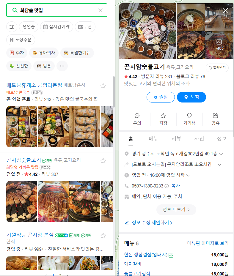 먼저 곤지암 숯불갈비 입니다. 고기 메뉴치고 18000원이면 그래도 준수한 가격이라 생각이 듭니다.